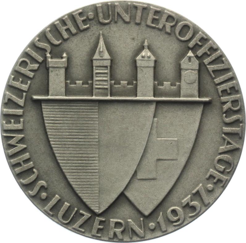 Eine Art Schützenmedaille zu den Unteroffizierstagen 1937 in Luzern Referenz: -/- Material: Silber 925 Gewicht in Gramm: 18.7 Durchmesser mm: 35 Rand: glatt Qualität: fast vorzüglich Medailleur: Stockmann
