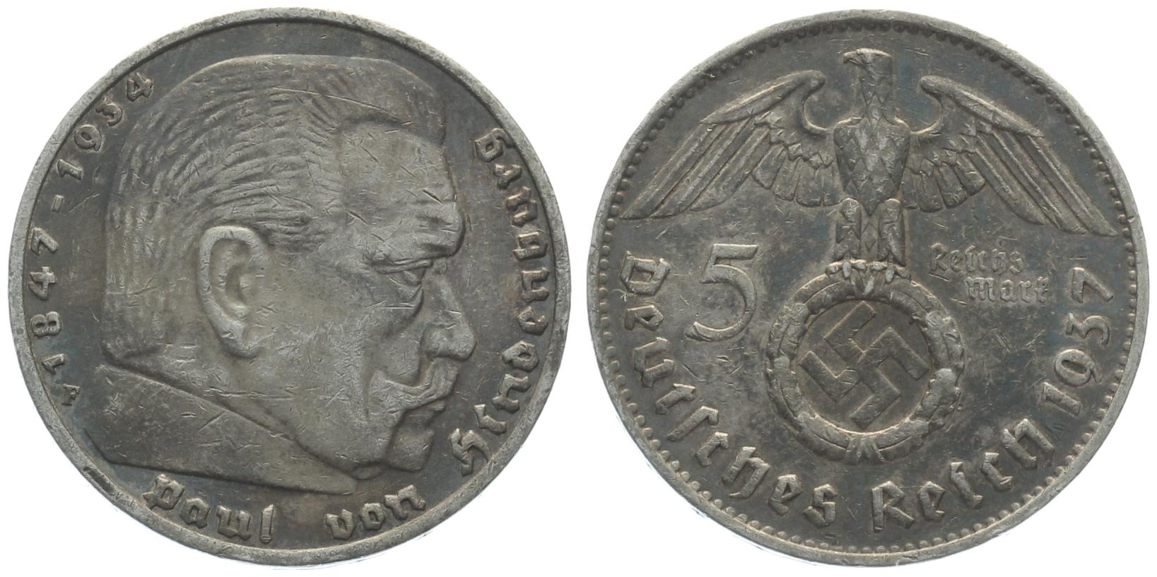 3. Reich 5 Mark 1937 F - Adler über Hakenkreuz
