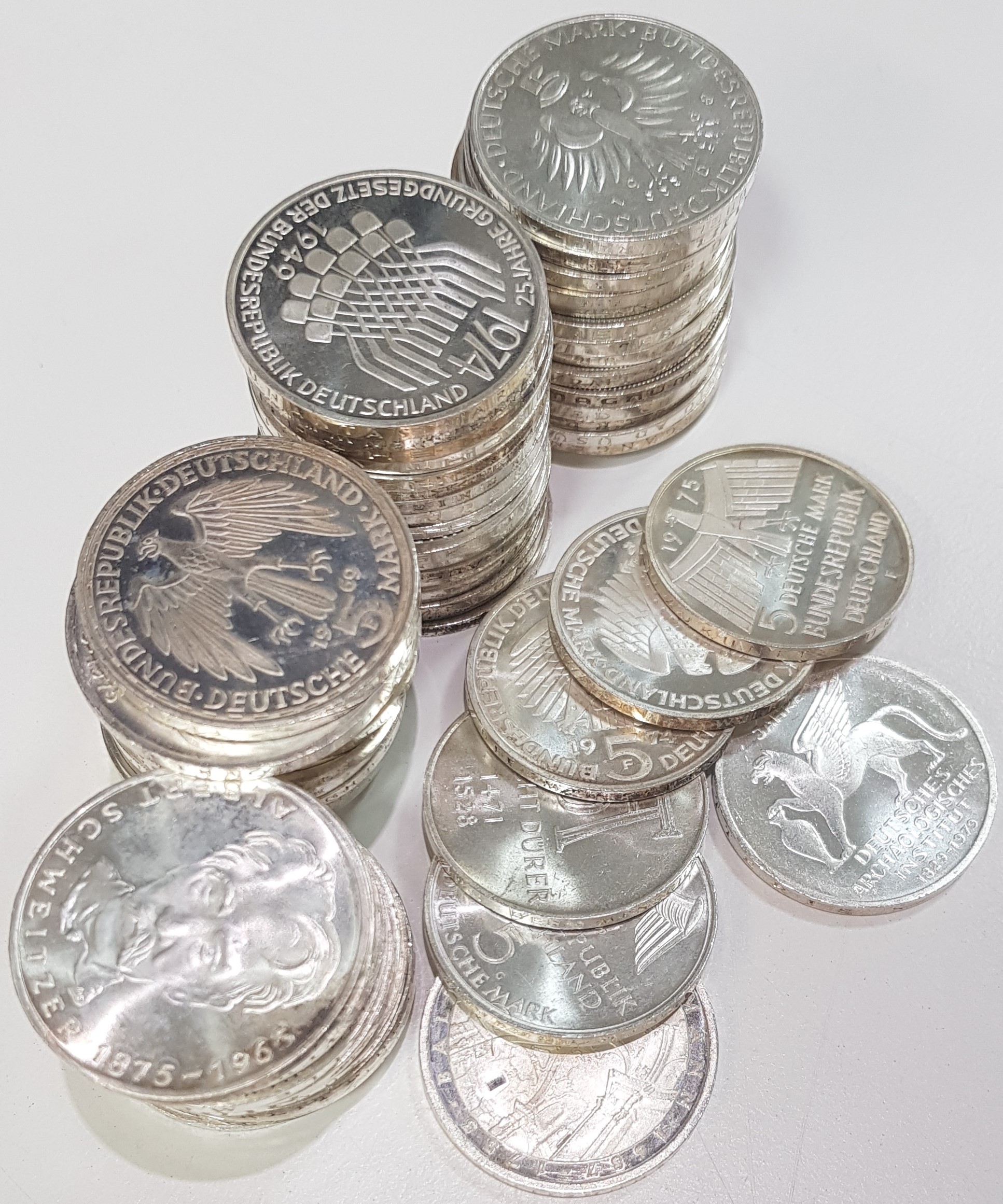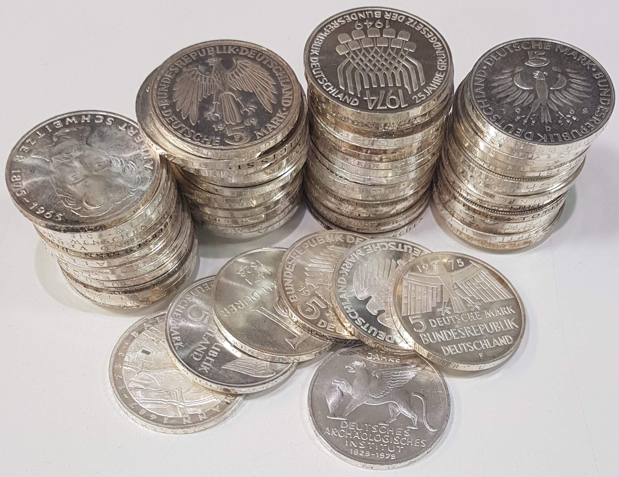 BRD Silbermünzenlot Material: Silber Menge: 30 Stück Gewicht: je 11.1 Gramm Total-Gewicht: 333 Gramm Feingehalt: 0.625 Durchmesser: 28.7 mm Qualitäten: diverse