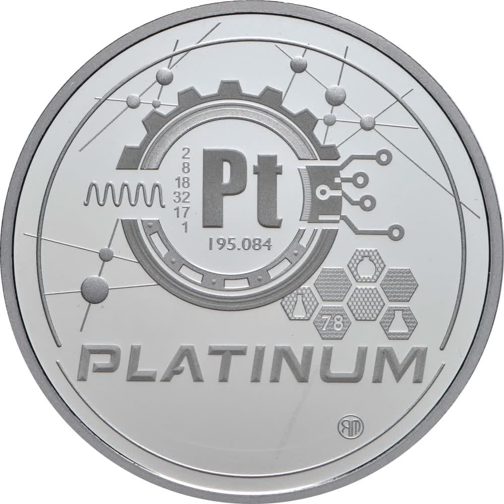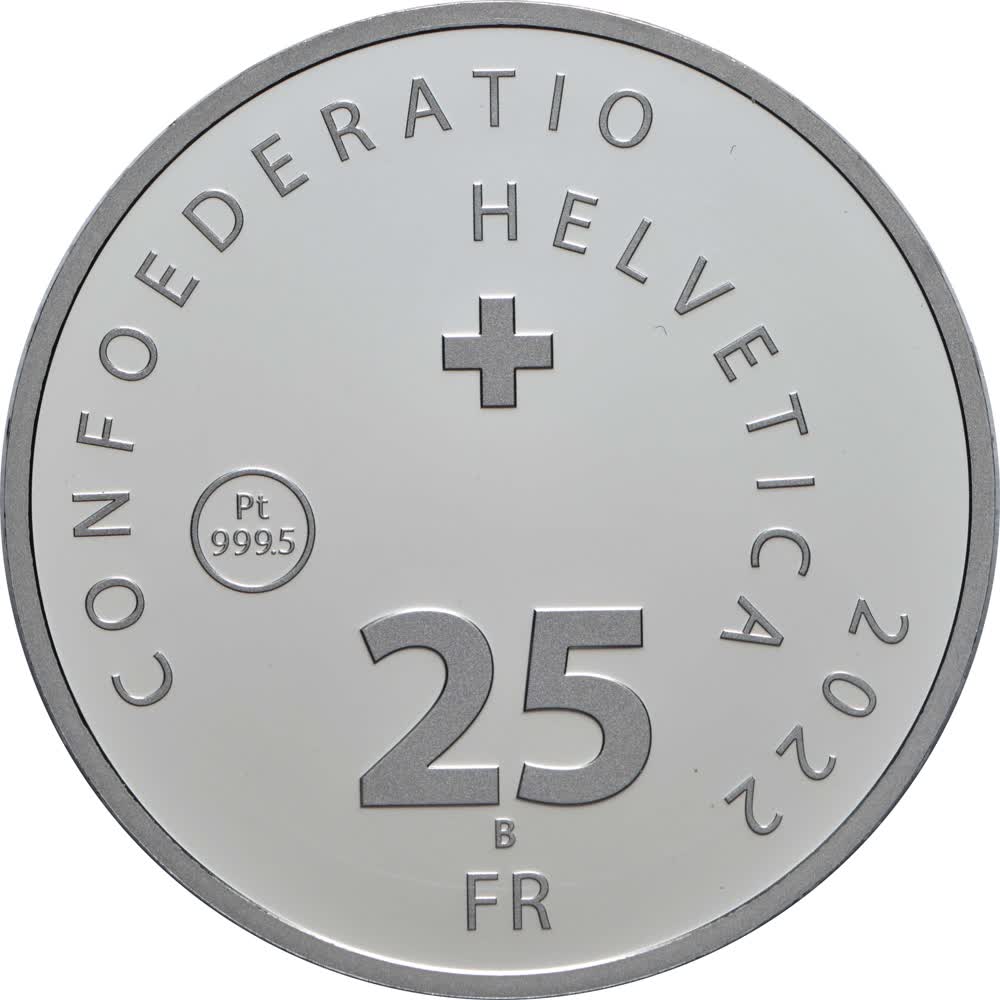 Mit der Herausgabe der Münze «Platinum» mit einem Nominalwert von 25 Franken lanciert Swissmint zum ersten Mal eine Sonderprägung in Platin. Diese Münze gelangt nur in der Qualität polierte Platte im Etui mit nummeriertem Echtheitszertifikat in den Verkauf und kann ausschliesslich im Internetshop unter www.swissmintshop.ch erworben werden. Auf der Bildseite ist eine moderne Illustration des Rohstoffs Platin zu sehen. So zeigt diese u. a. im Zentrum eines Zahnrades das Symbolelement Pt für Platin. Links davon stehen in einer Zahlenaufreihung die einzelnen Elemente des Periodensystems, die in der Summe 78 ergeben. Unter dem Symbolelement Pt ist die Zahl 195.084 erwähnt, welche der Atommasse entspricht. Im unteren Drittel der Bildseite ist ferner in Grossbuchstaben und kursiv die Bezeichnung «PLATINUM» ersichtlich. Die Gestaltung der Münze erfolgte durch den Graveur der Swissmint, Remo Mascherini.