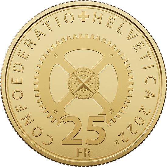 Es handelt sich dabei um die erste Goldmünze von Swissmint mit einem Nominalwert von 25 Franken, welche in den Umlauf gelangt. Die Anfänge der Uhrmacherei in der Schweiz sind eng verbunden mit den hugenottischen Glaubensflüchtlingen, welche im 16. Jahrhundert nach Genf kamen und ihr Fachwissen mitbrachten. Von der Calvin-Stadt aus verbreitete sich die Uhrmacherei in allen Teilen der Schweiz. Die Wichtigkeit der Schweizer Uhrenindustrie und die weltweite Verbreitung ihrer Produkte ist auf der Münze symbolisch dargestellt mit Uhrwerk und Weltkugel. Die 25-Franken-Goldmünze ist in limitierter Auflage nur in der Qualität «Polierte Platte» im Swissmint Online-Shop, sowie bei gewissen Münzenhändlern erhältlich. Die Gestaltung erfolgte durch den Bieler Künstler Remo Lienhard