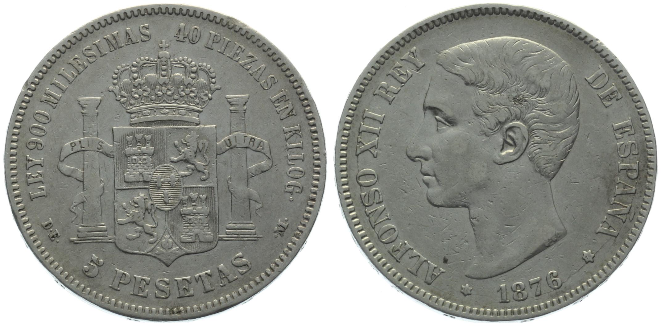 Spanien 5 Pesetas 1876 DE M - Alfonso XII.